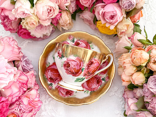 クイーンアン ピンクの大輪のバラと豪華な金彩のカップ&ソーサー