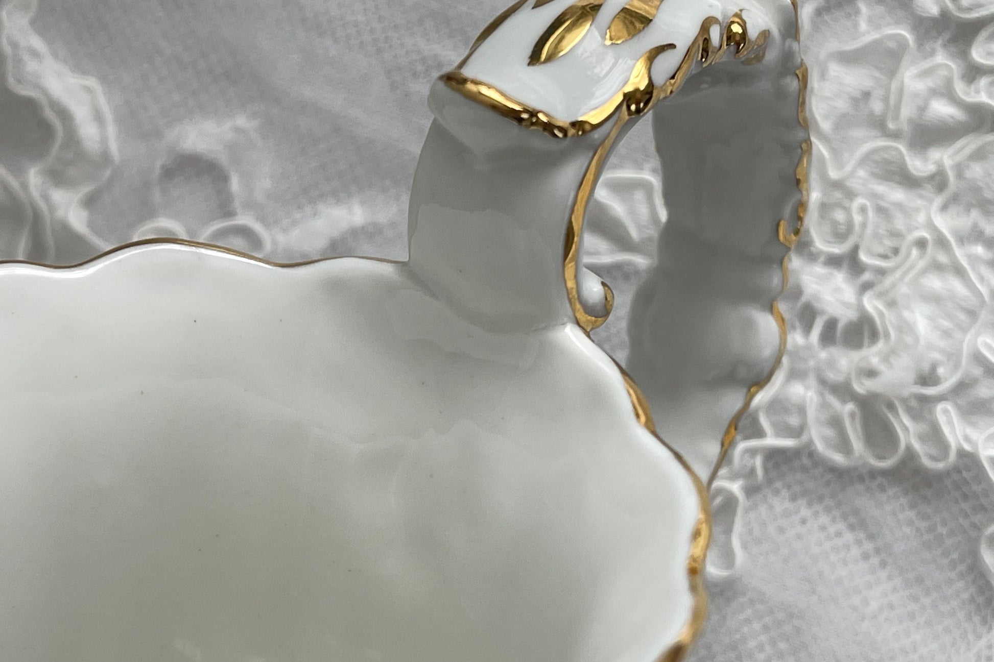 1ヶ所2cmほどのヘアラインと付け根にクラックがあります。また、注ぎ口に製造時にできるとても小さな黒点があります。そのほかは、金彩のスレもほとんど見られず、ヒビ・貫入はありません。