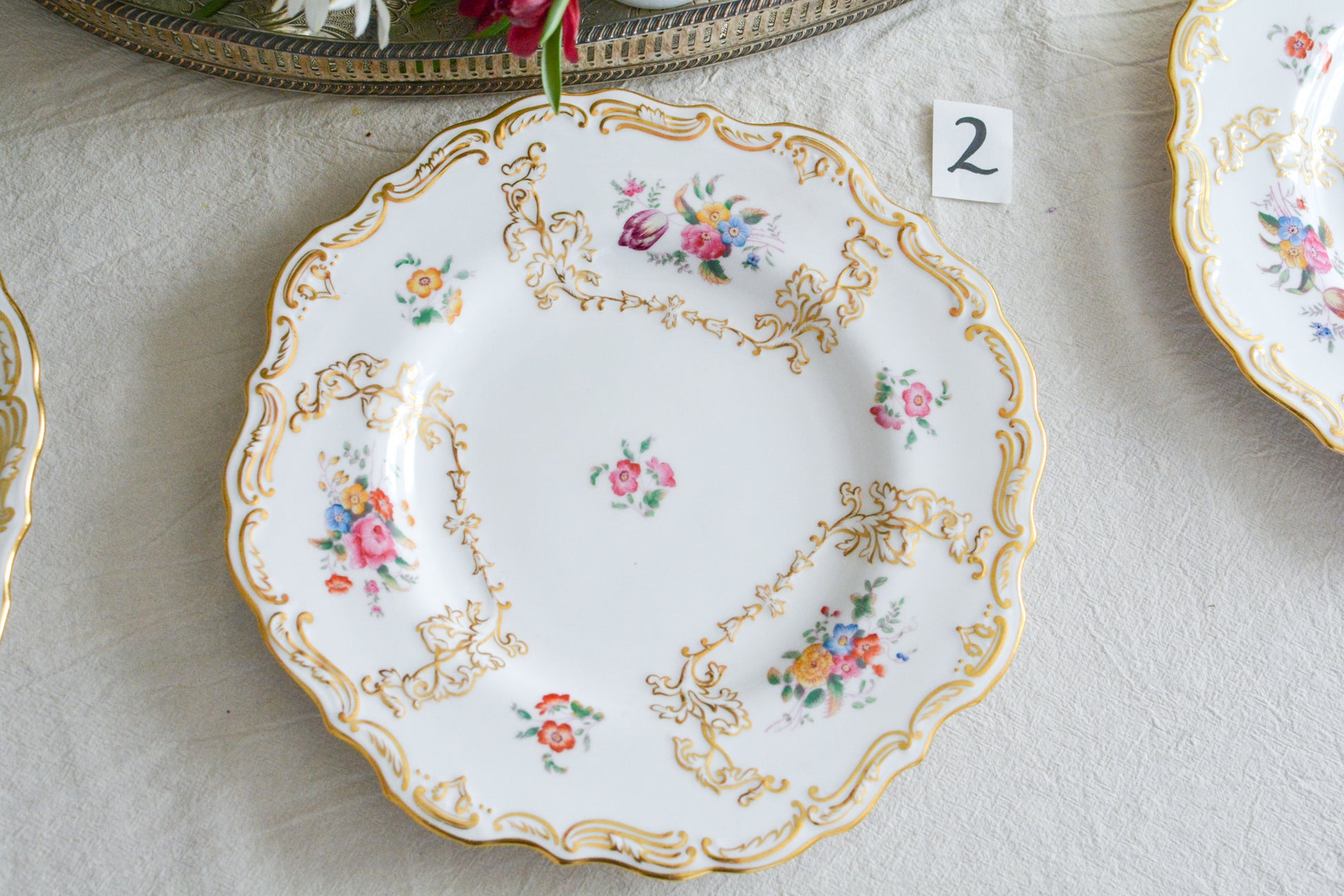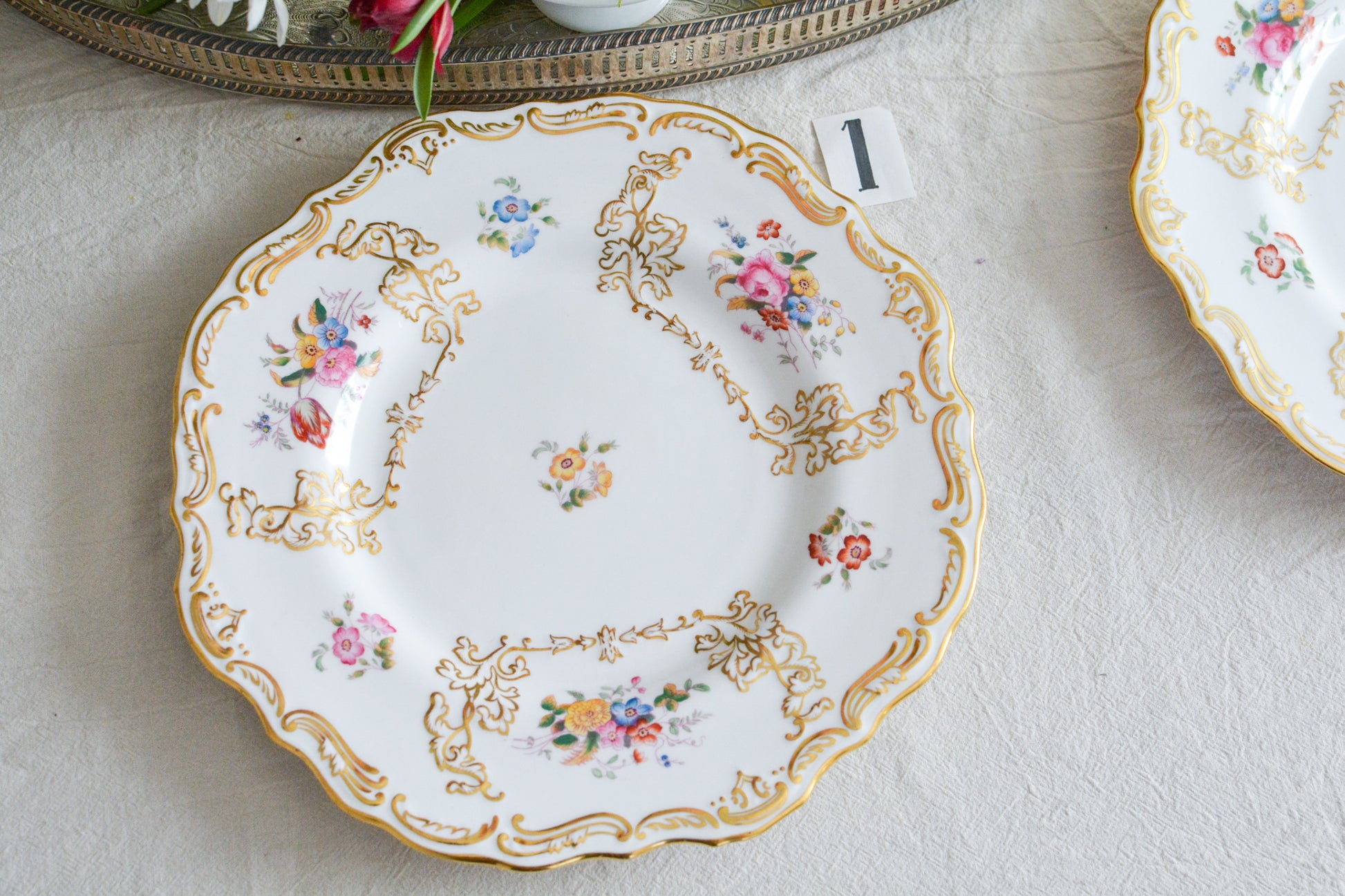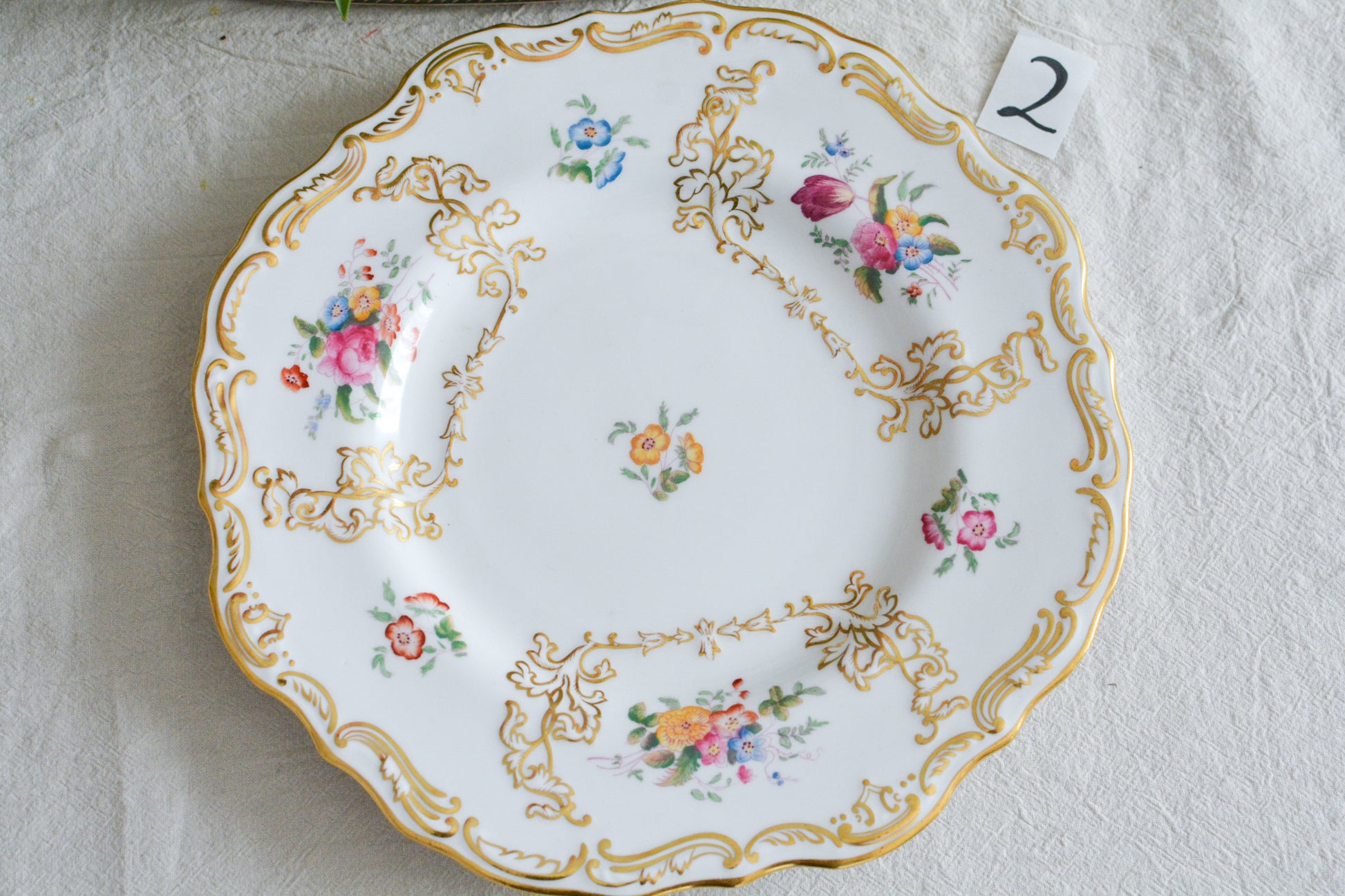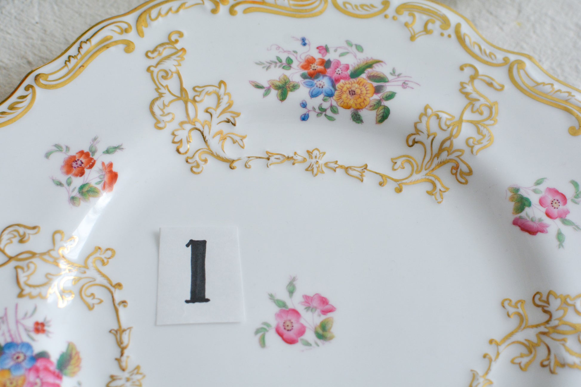 エンボスの上に金彩のエレガントな模様と花々が描かれたコープランドのプレートです。とても美しくて、ハンドペイントの為、お花のデザインは一枚ずつ異なります。どんなデザートをのせるか楽しみになりますね。ティータイムにたくさん活躍してくれそうです。こちらは1枚の価格です。全部で6枚在庫がございます。少しずつ絵柄が違いますので①〜⑥からお選びください。