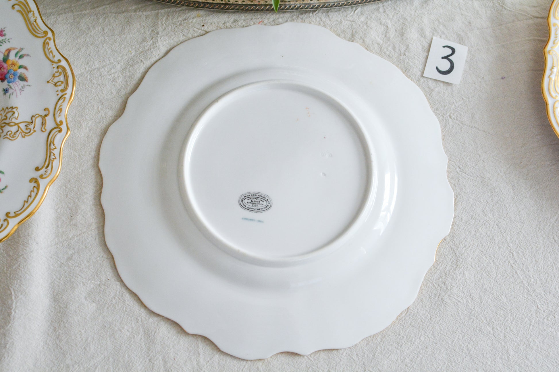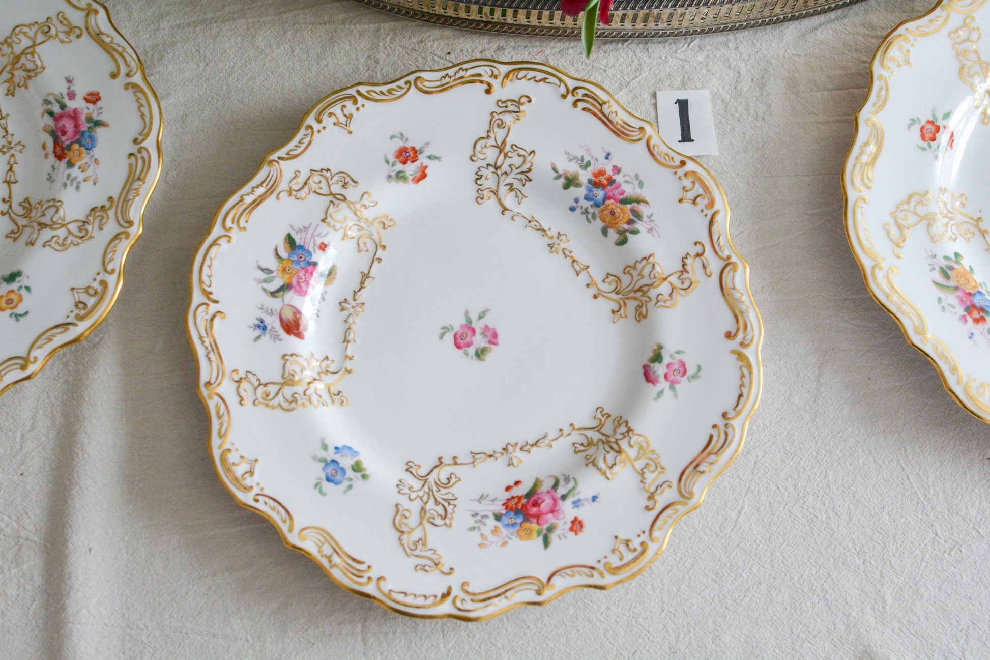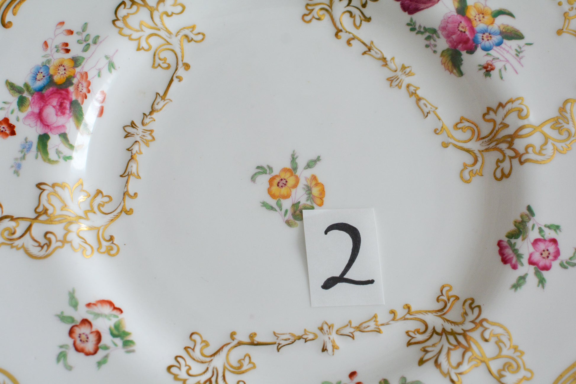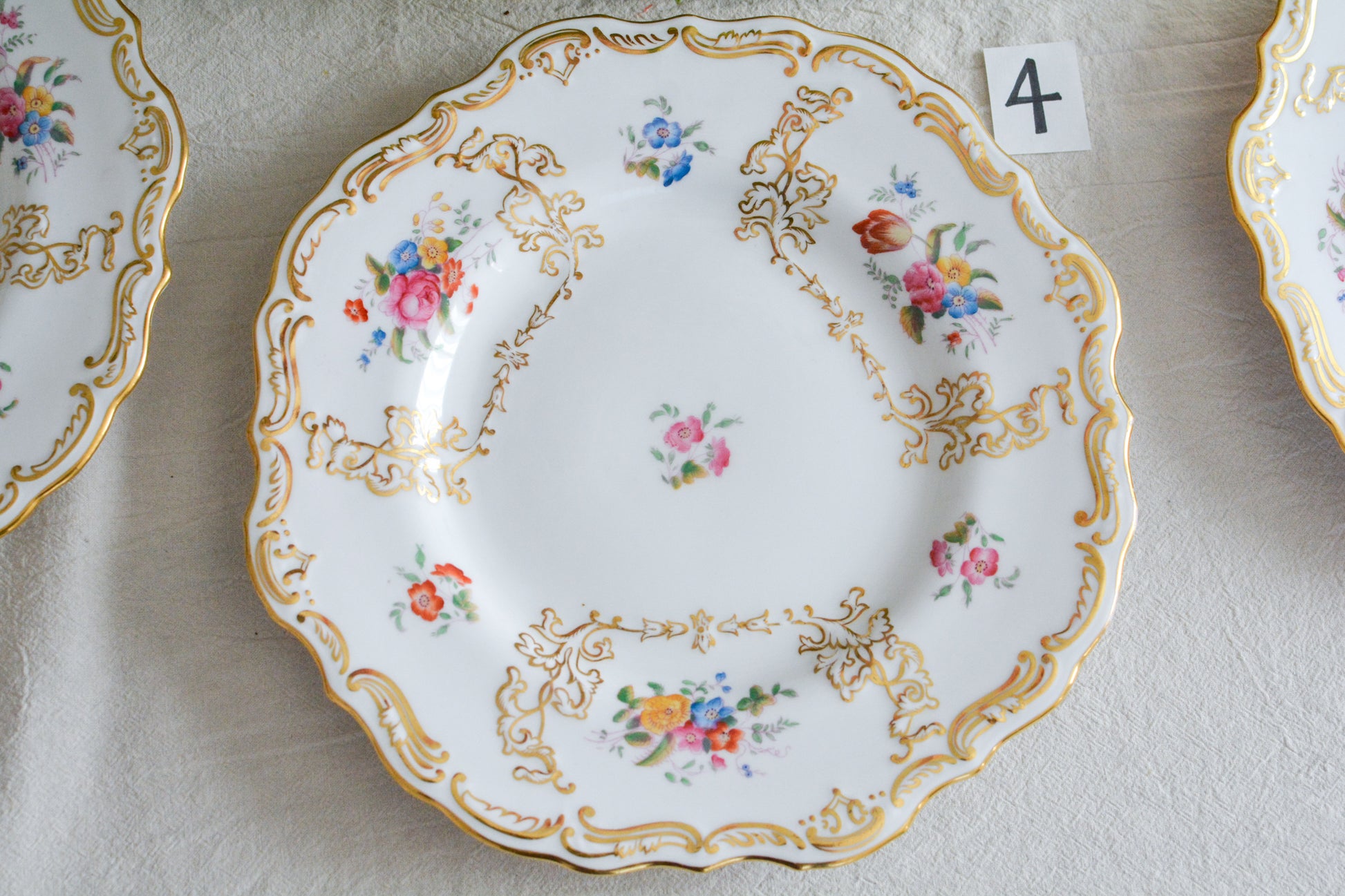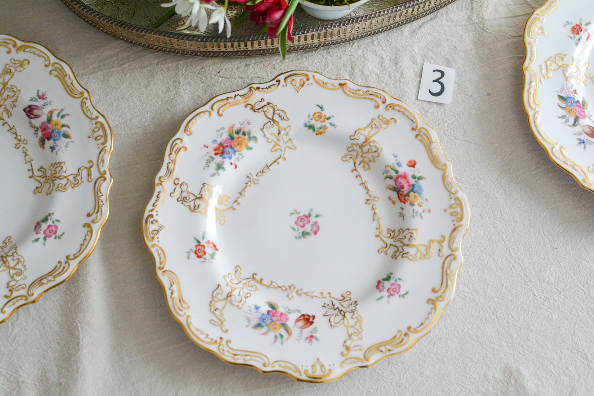 エンボスの上に金彩のエレガントな模様と花々が描かれたコープランドのプレートです。とても美しくて、ハンドペイントの為、お花のデザインは一枚ずつ異なります。どんなデザートをのせるか楽しみになりますね。ティータイムにたくさん活躍してくれそうです。こちらは1枚の価格です。全部で6枚在庫がございます。少しずつ絵柄が違いますので①〜⑥からお選びください。