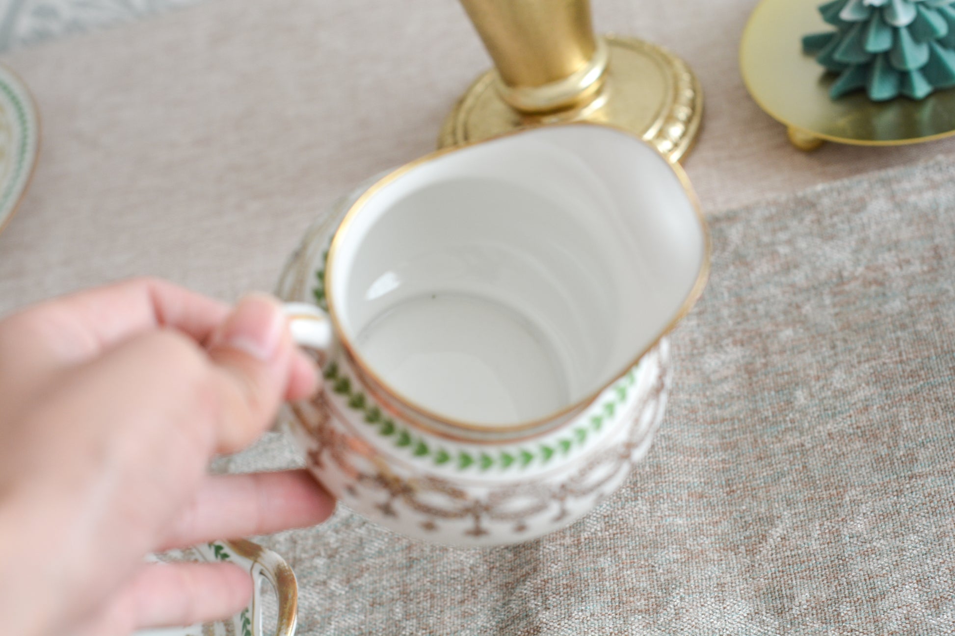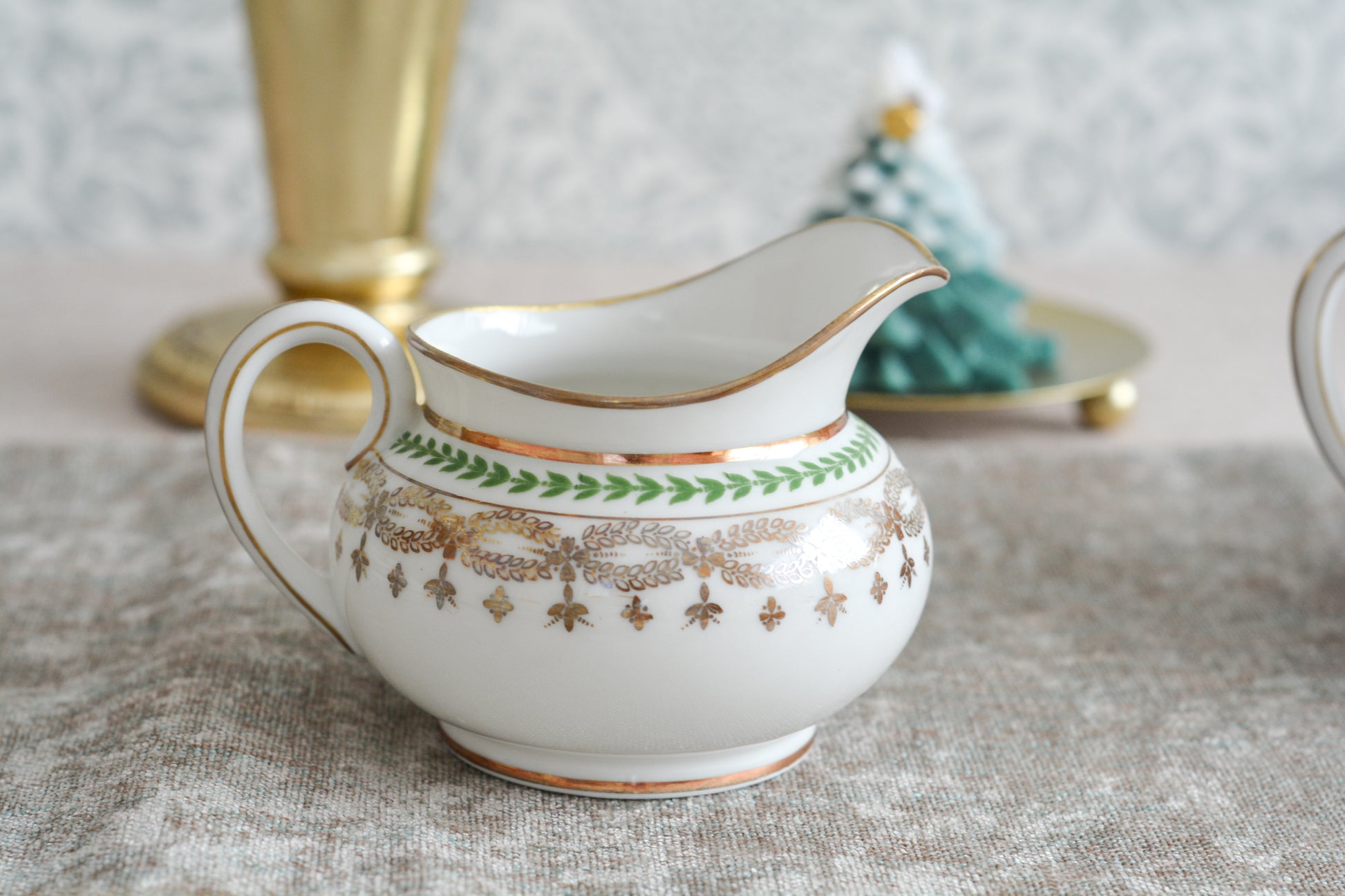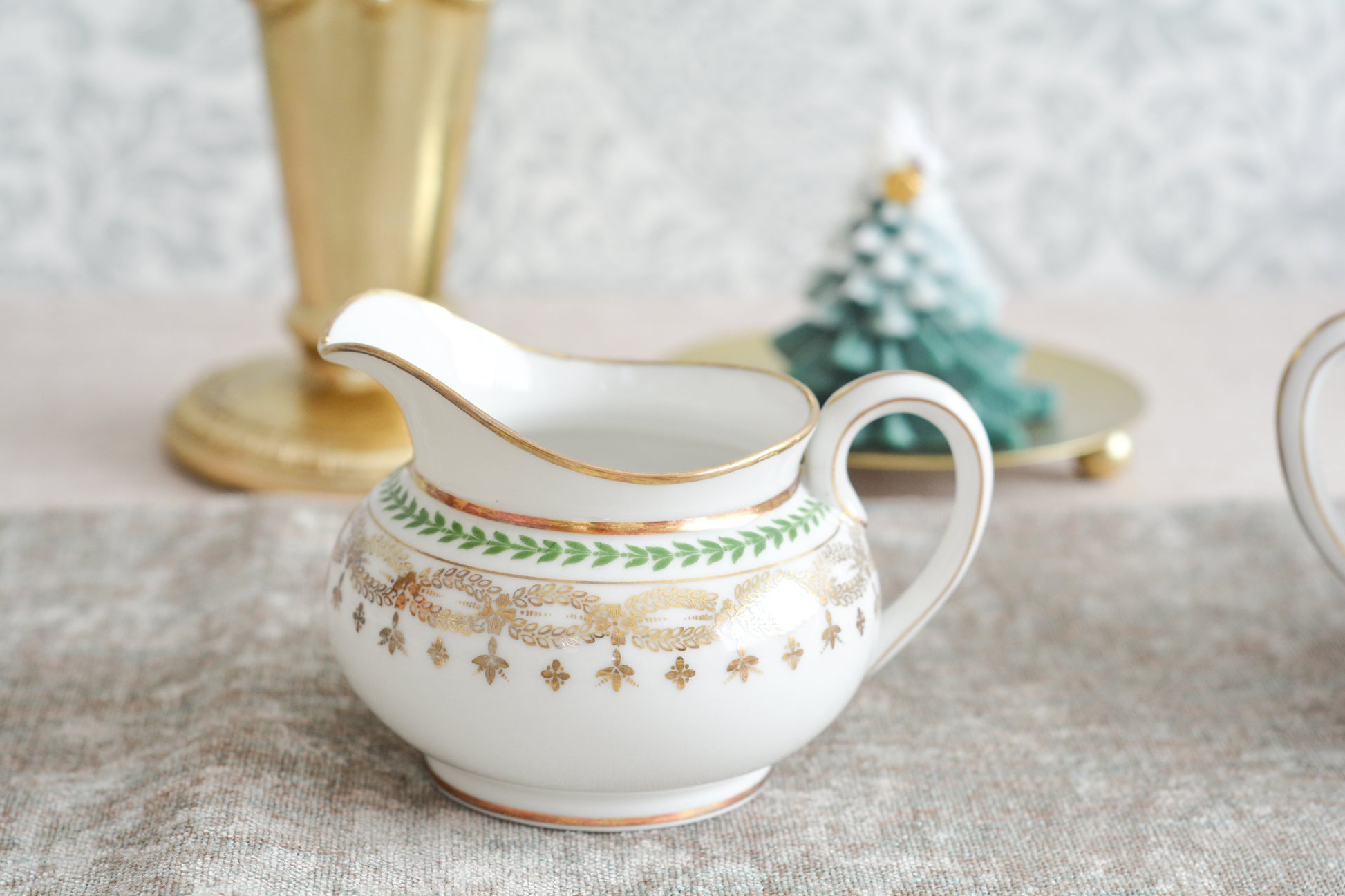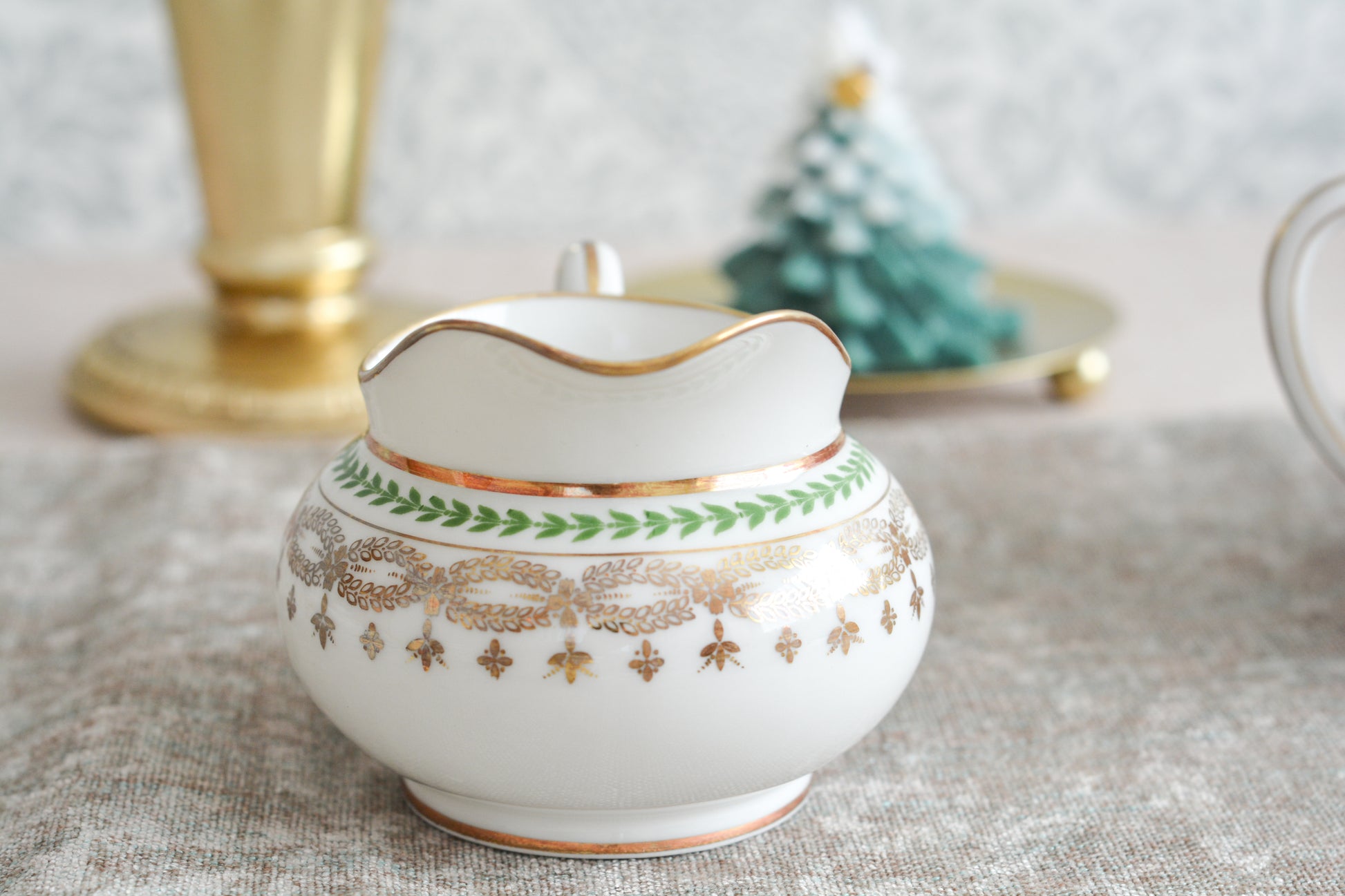 クリスマスの特別価格になっています。同じデザインのティートリオ、シュガー入れ、サービングプレート、小さなプレート、とても小さなプレートのセットを別で掲載していますのでセットでコーディネートもお楽しみいただけます。