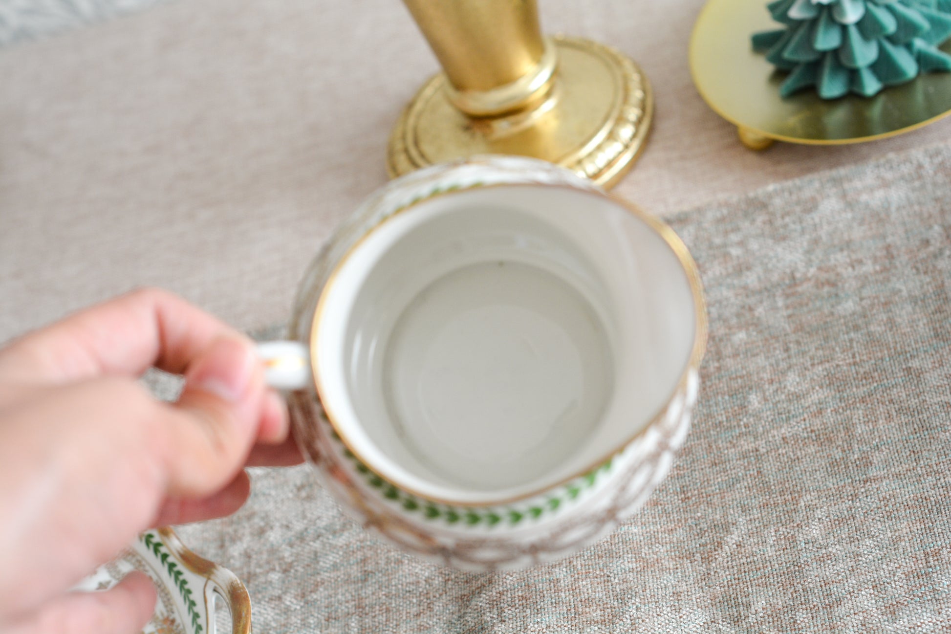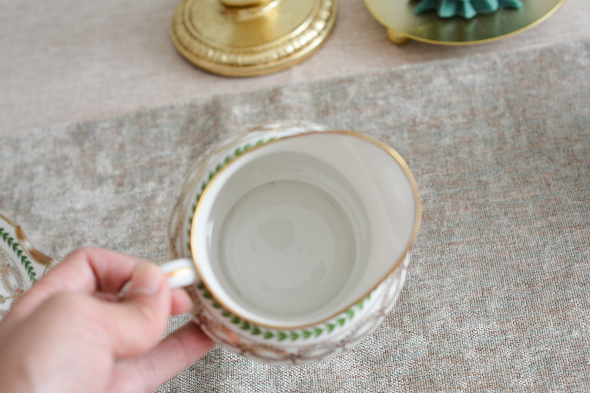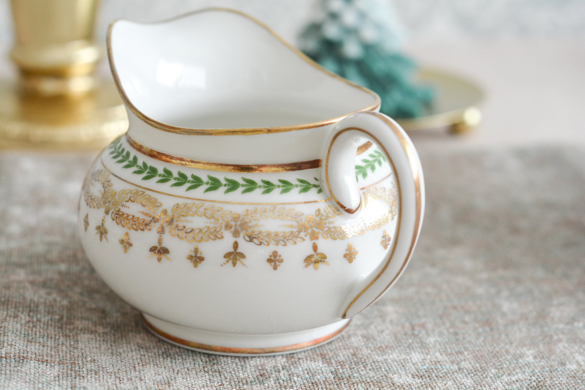 フランスのリモージュ、ジャン・プーヤ工房のティートリオです。デザインはシンプルですが、上品でクリスマスのティータイムやテーブルコーディネートにぴったりなお品。ぜひクリスマスのティータイムなどにお楽しみいただきたいです。小さなお花を入れても素敵です。