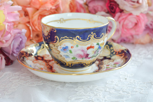コバルトブルーにハンドペイントの花々が美しいカップ&ソーサー