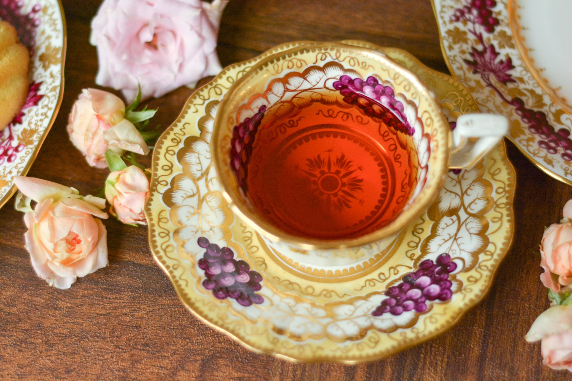 コールポートの葡萄の模様のカップ&ソーサー。大きな葡萄がとても美しく、紅茶を淹れるとキラキラと輝くように見えます。アンティークらしい大胆な絵柄と美しい色合いのカップ&ソーサーで秋のティータイムをゆっくりをお楽しみください。