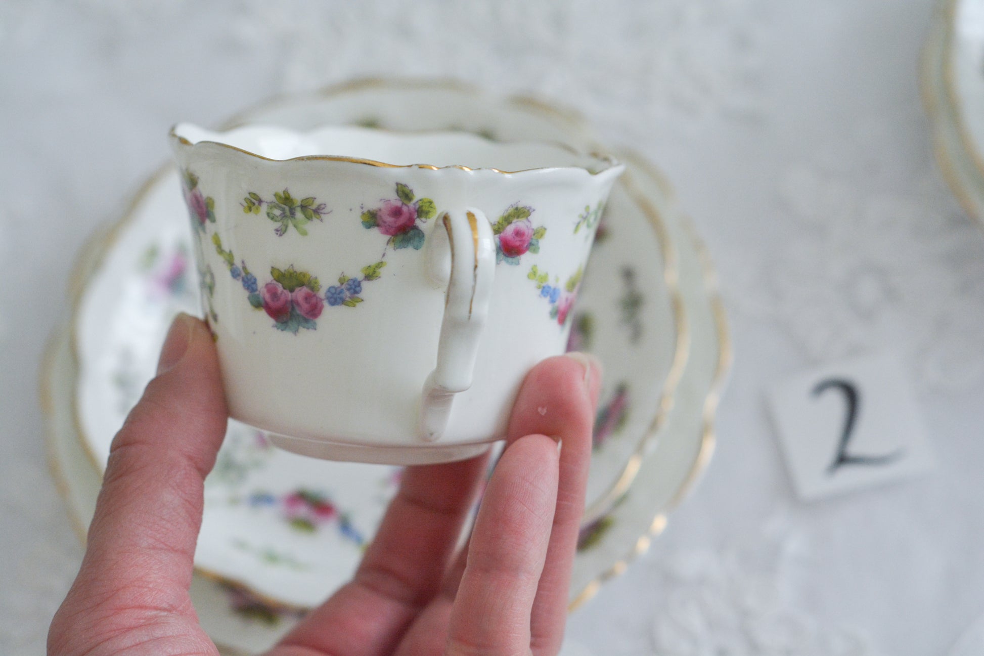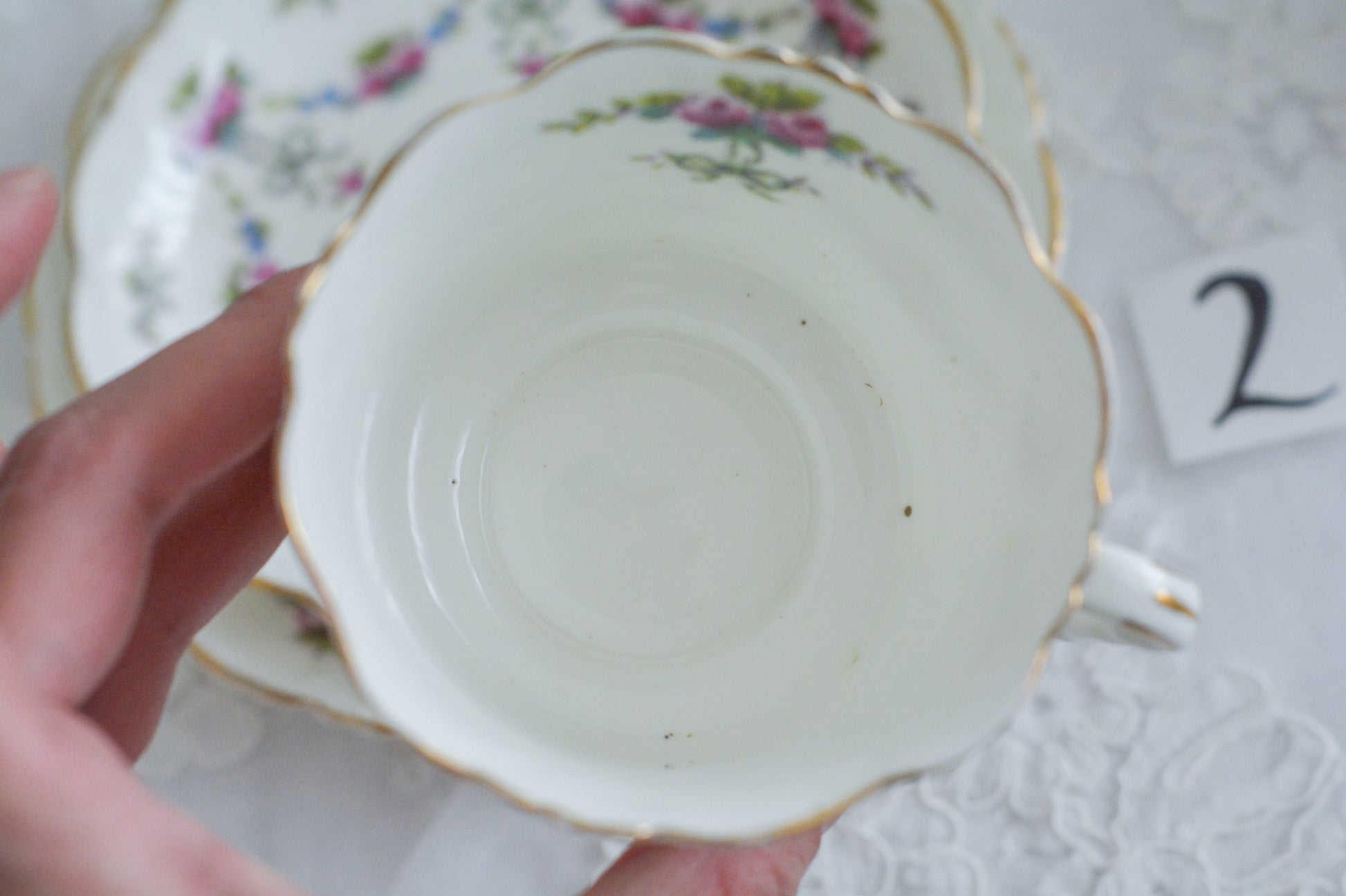 ティートリオ①売り切れました。カップに製造時にできる小さな茶点、プレートの裏面に色飛びがあります。ティートリオ②ソーサーに一部小さな変色、裏面に小さな素磁ムラ、プレートの裏面に素磁ムラがあります。