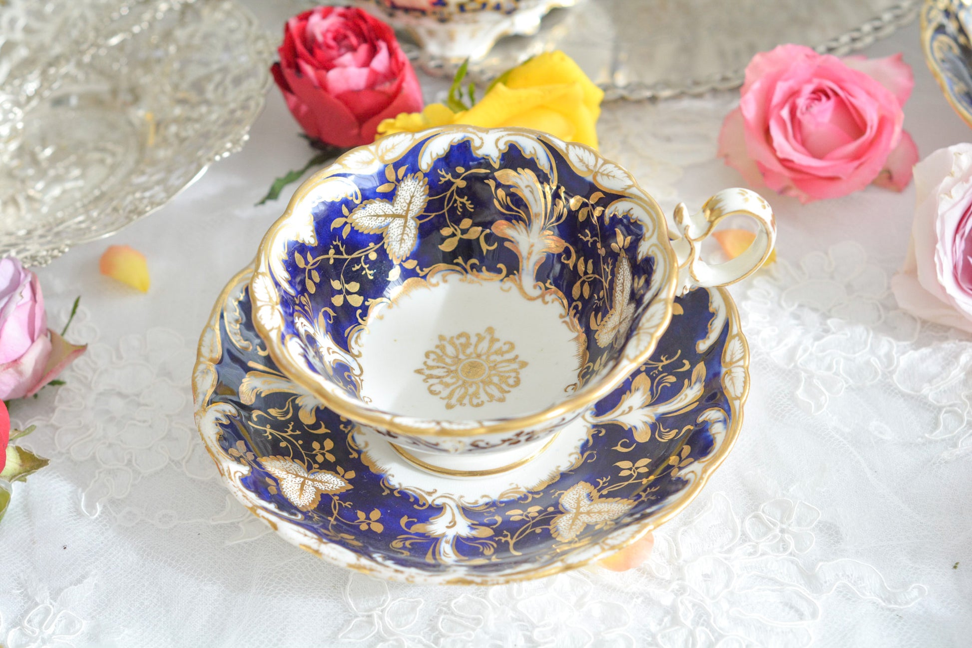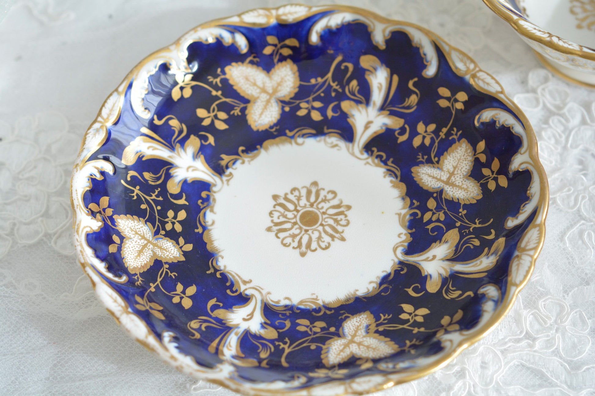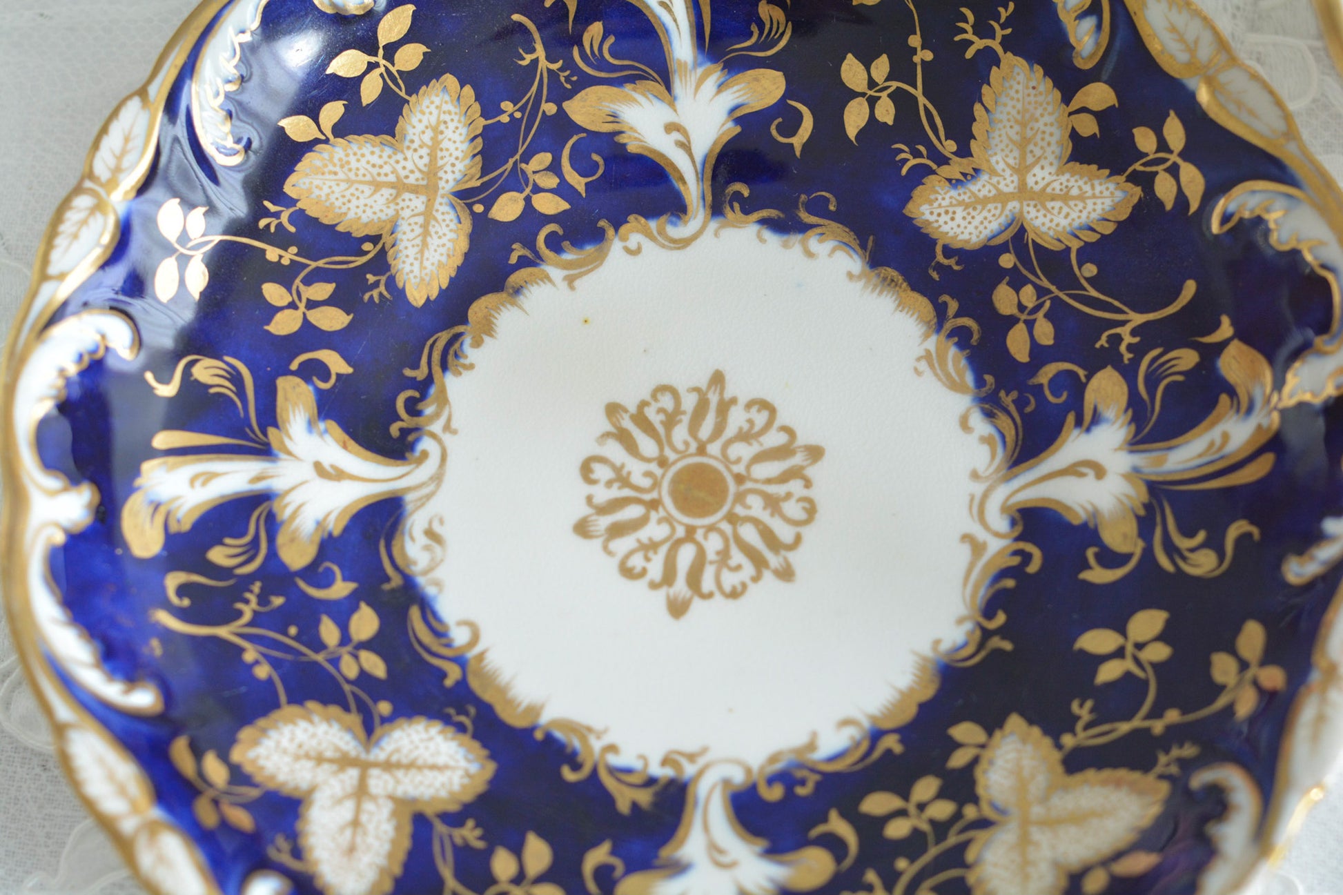 コバルトブルーに金彩の葉っぱ模様が大変美しい、コールポートアデレードシェイプのカップ&ソーサーです。優美なシェイプは大変美しく、重厚感がありながら繊細さも感じるお品です。カップに1ヶ所古いヒビが入っているためお値打ち価格になっています。ヒビはあるものの、ロココリバイバルの大変美しいカップです。