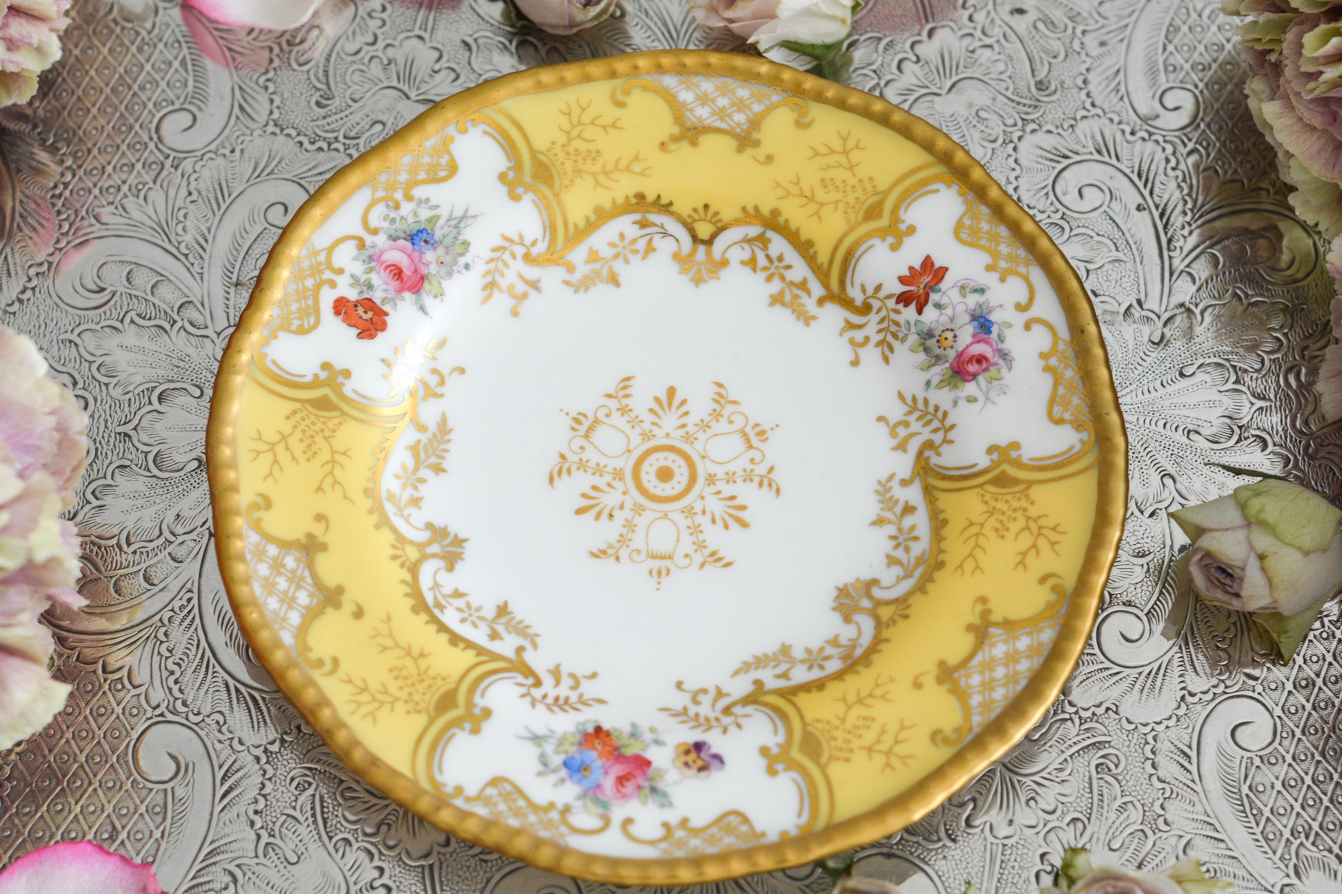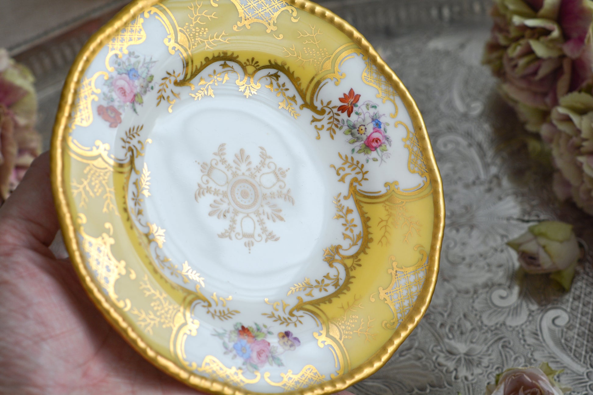 コールポートの人気シリーズ、バットウィングシリーズ。レアカラーのイエローカラーのトリオです。イエローのバットウィングは、鮮やかなイエローカラーが美しく、とても華やかな印象です。最近はバットウィングシリーズは探すことがより困難になっております。残念ながらカップにヒビが入っている為に観賞用となっております。(水漏れしたり、カップ自体が割れてしまう可能性があるため、カップに紅茶などを入れることは難しいです)ソーサーとサイドプレートはとても良い状態です。カップにヒビはあるものの観賞用としては大変美しく、貴重なお品です。ぜひコレクションとしてこのカップをお楽しみください。