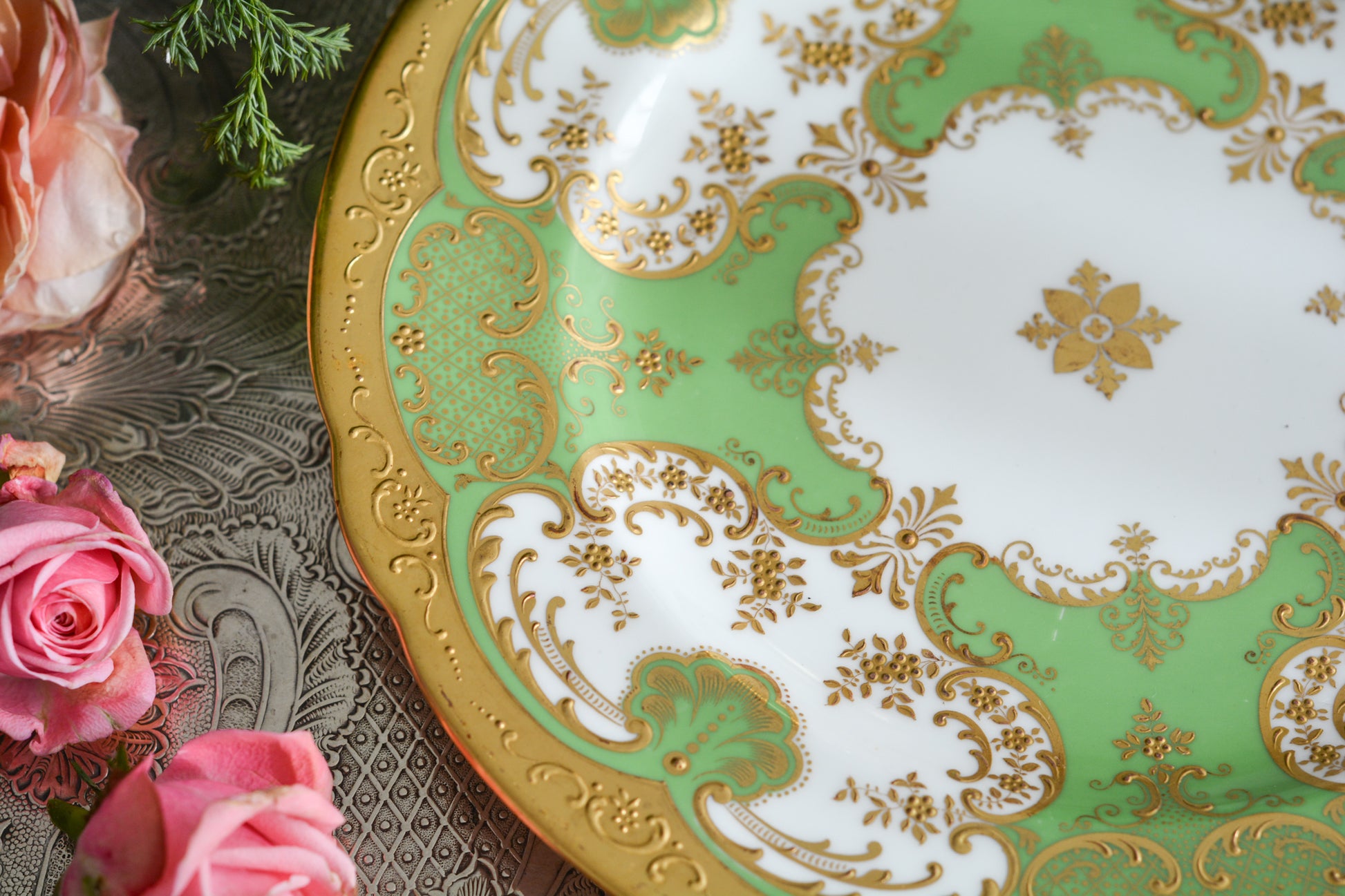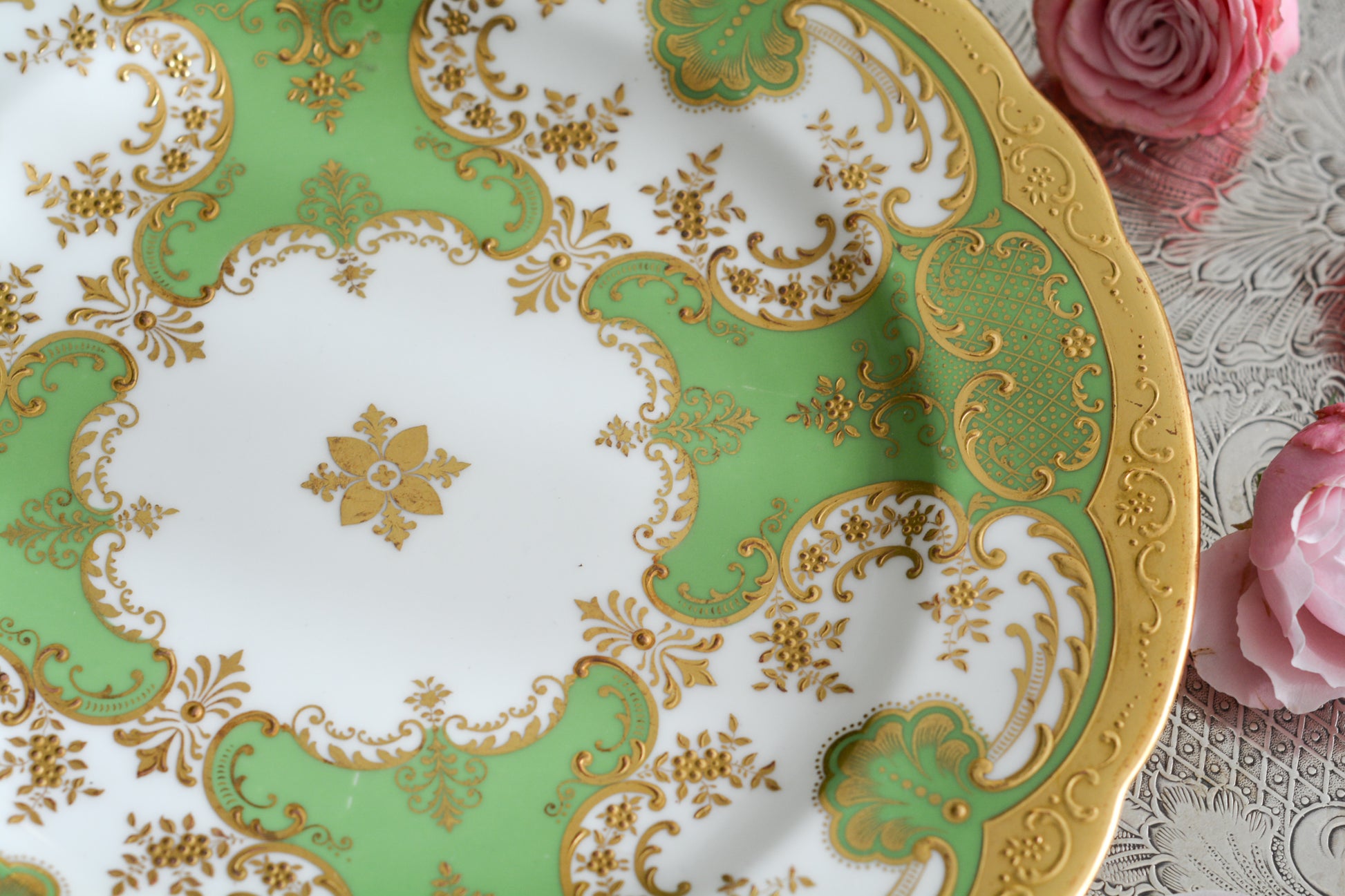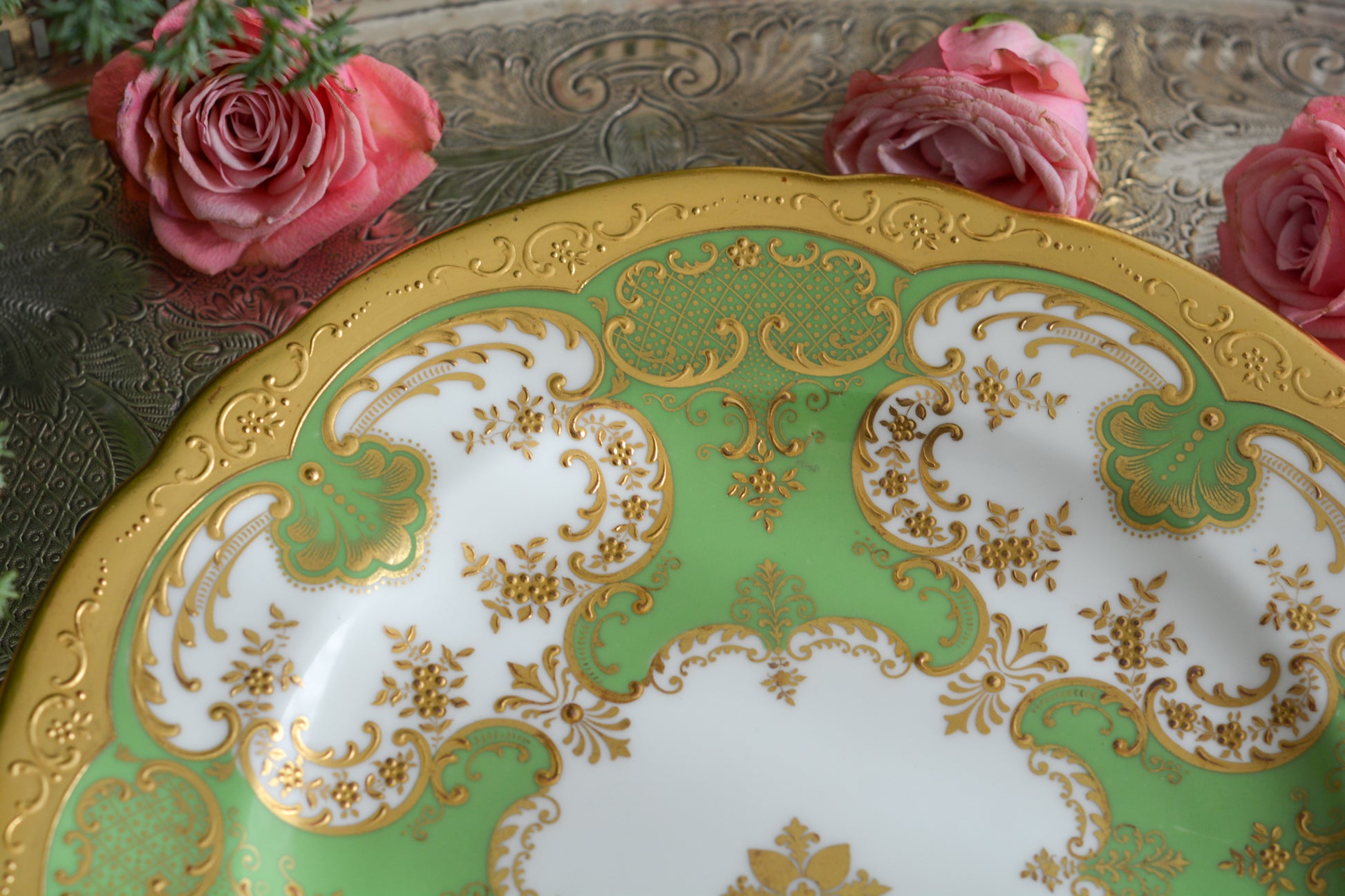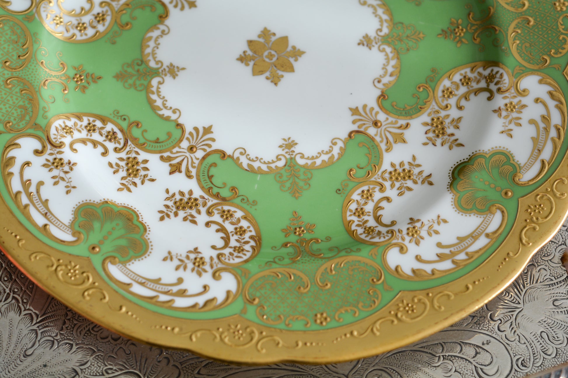 ティファニーがコウルドンに特注した美しいプレート。アップルグリーンカラーにたいへん繊細で豪華な金盛りの金彩模様が芸術品のプレートです。キャビネットプレートとしても、特別な日のコーディネートにも。素晴らしいお品です。