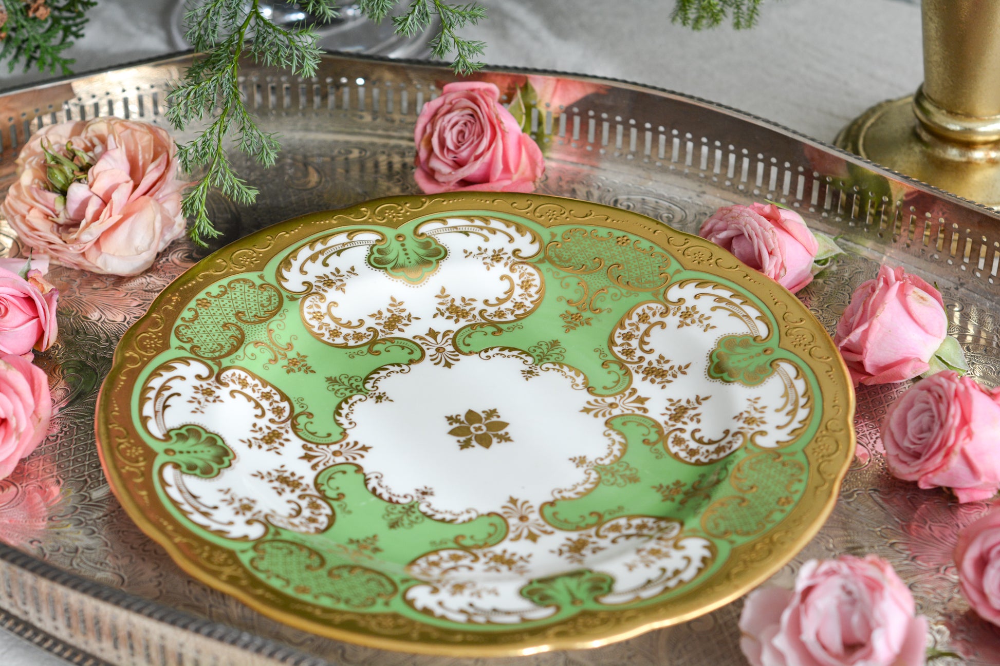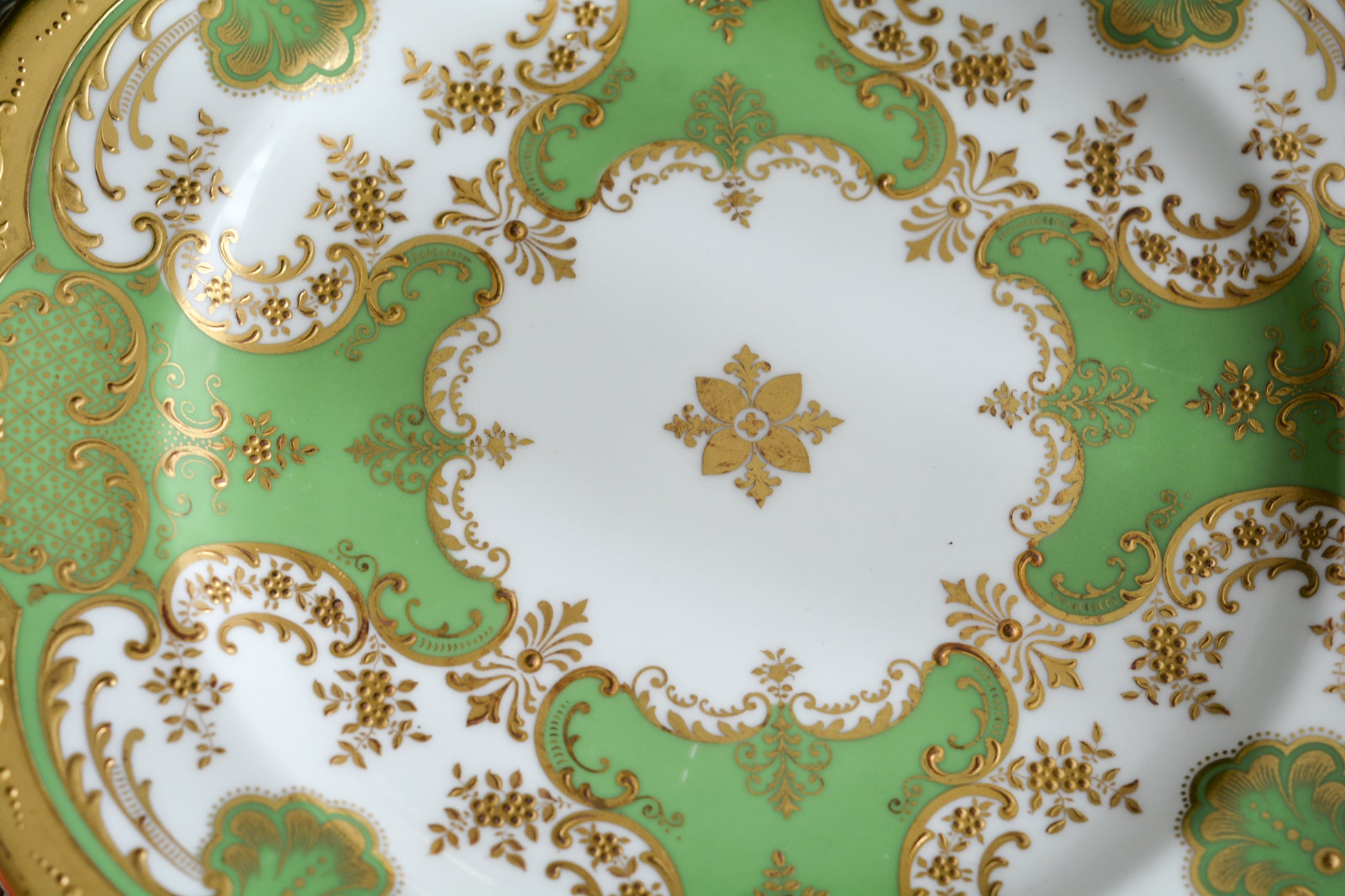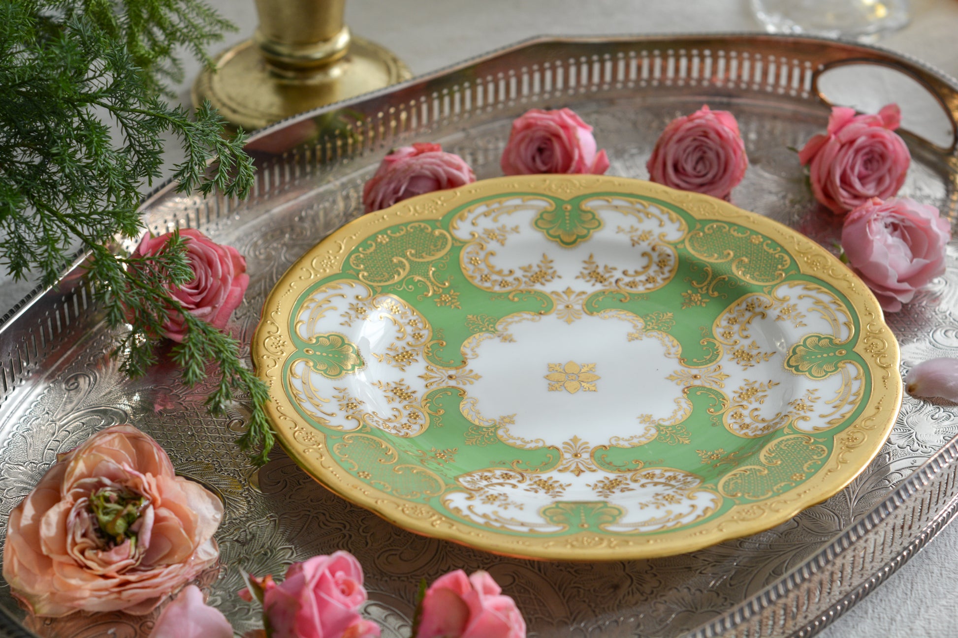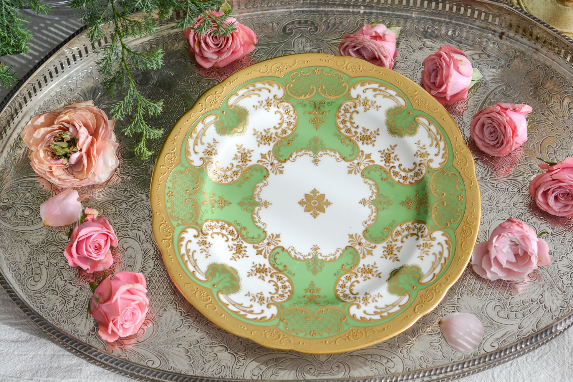 ティファニーがコウルドンに特注した美しいプレート。アップルグリーンカラーにたいへん繊細で豪華な金盛りの金彩模様が芸術品のプレートです。キャビネットプレートとしても、特別な日のコーディネートにも。素晴らしいお品です。